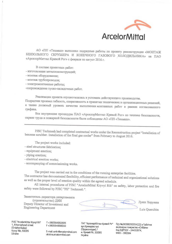 АТ «ВП «Техмаш» виконав підрядні роботи щодо проекту реконструкції «МОНТАЖ БЕНЗОЛЬНОГО СКРУБЕРА ТА КІНЦЕВОГО ГАЗОВОГО ХОЛОДИЛЬНИКА» на ПАТ «АрселорМіттал Кривий Ріг» з лютого по серпень 2016 р.